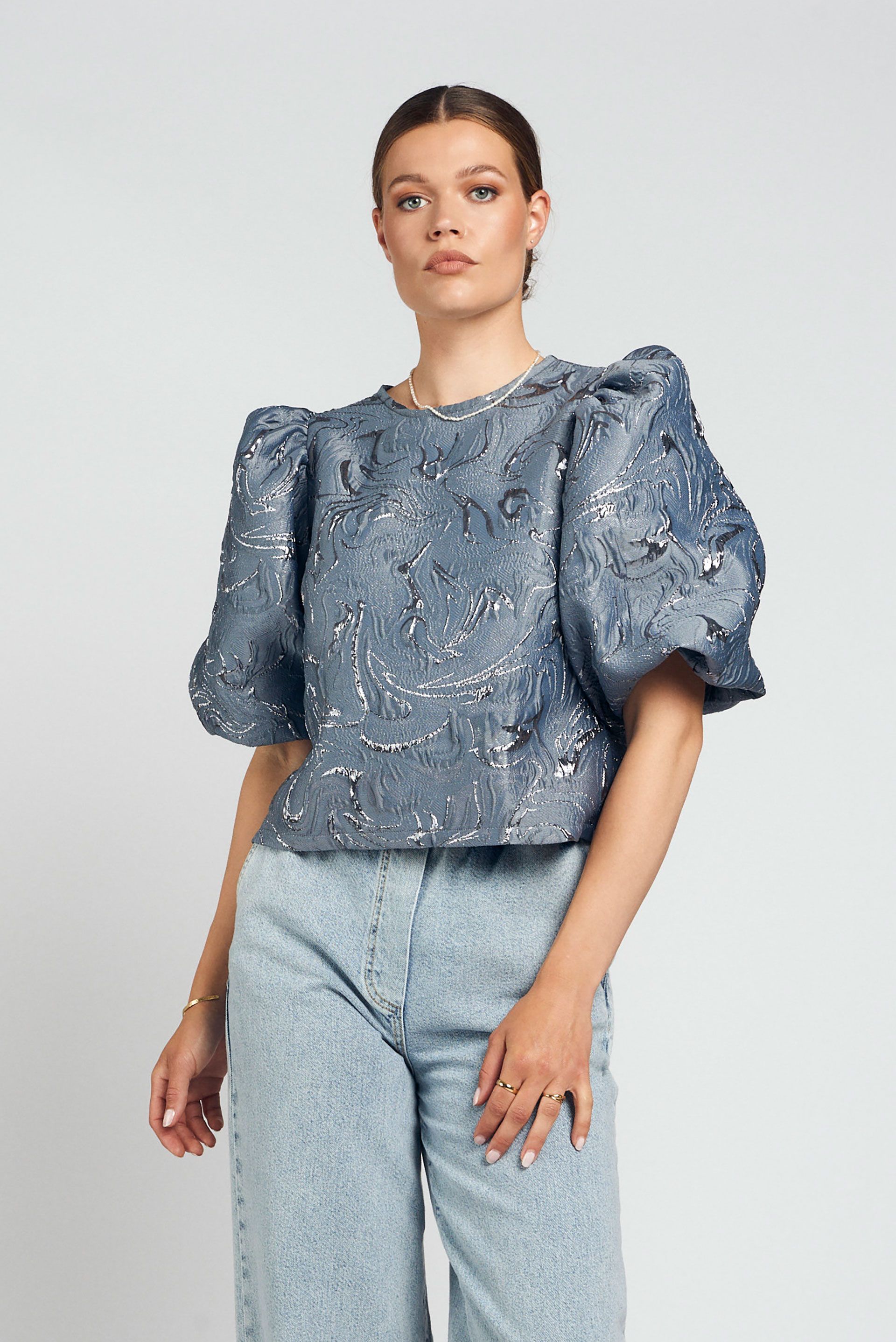 Maak een statement met de Bobby Top in een elegante Steel Blue Jacquard. Deze bijzondere top is een perfecte mix van structuur en luxe, met een rijke jacquardstof die subtiel glanst en een abstract patroon laat opvallen bij elke beweging.De volumineuze pofmouwen en licht boxy fit geven de top een moderne, vrouwelijke uitstraling – ideaal voor zowel een avond uit als een bijzondere gelegenheid overdag.