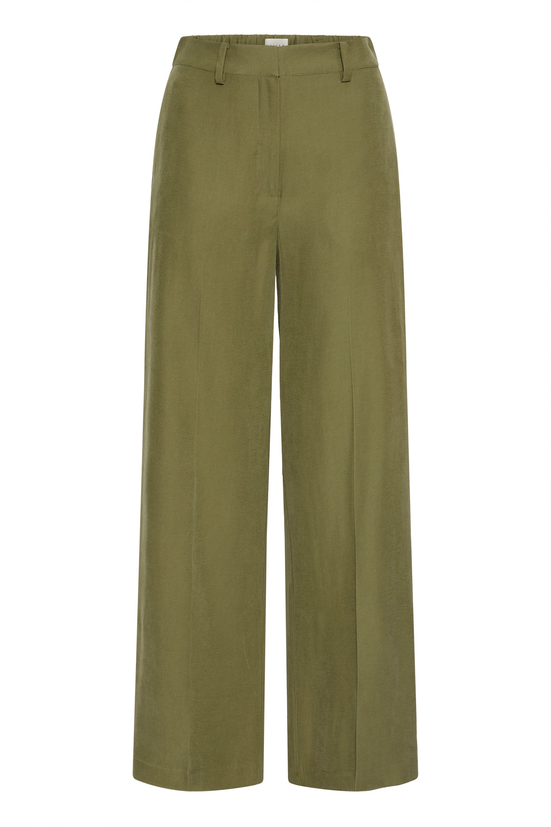 Deze olijfgroene broek met hoge taille en wijde pijpen is een stijlvolle essential voor elke garderobe. Het gladde, licht glanzende materiaal valt soepel en is perfect voor warmere dagen. Dankzij de verborgen sluiting en subtiele belijning oogt het silhouet strak en elegant.