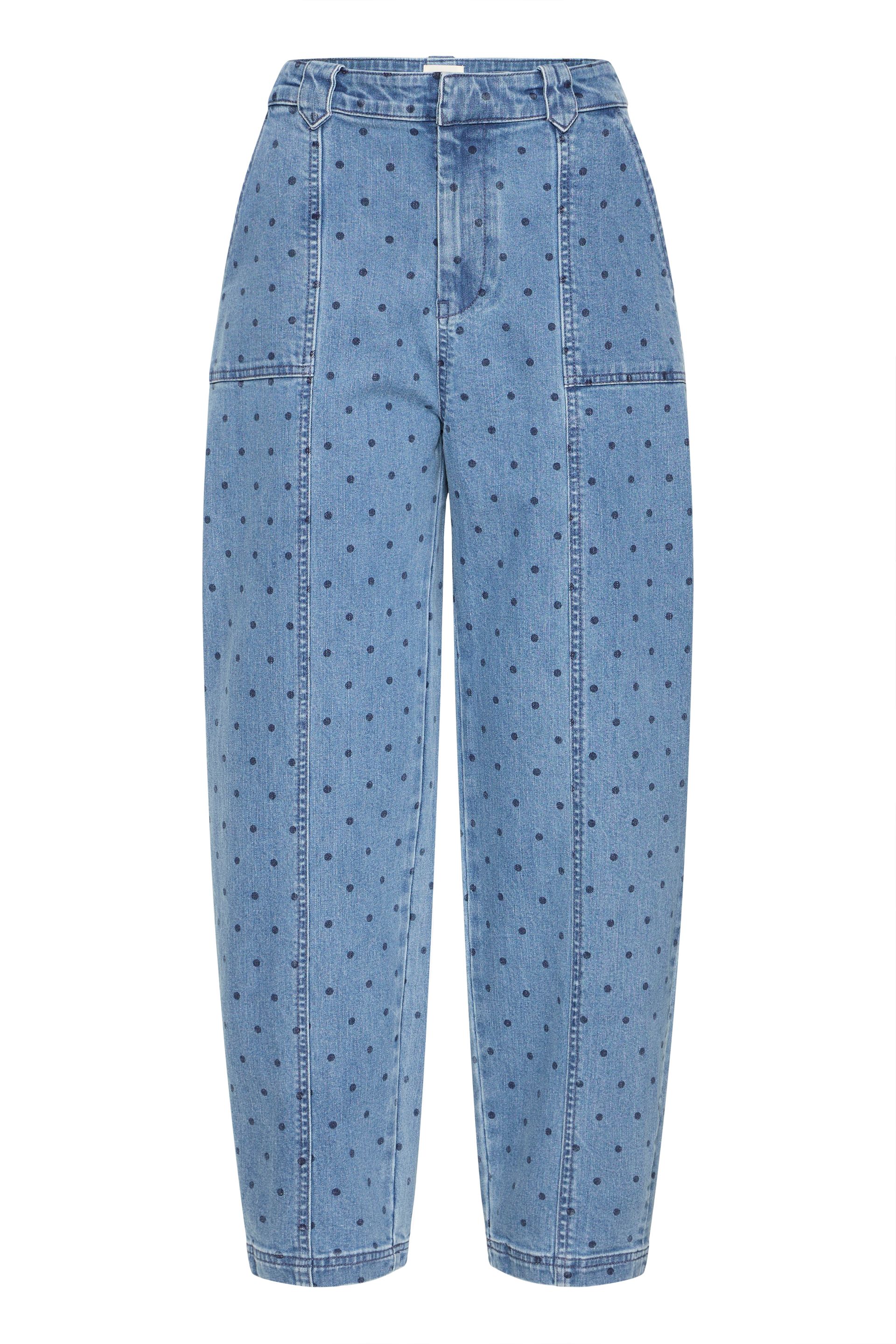 Deze high-waisted jeans in lichtblauw denim krijgt een verrassende twist dankzij het all-over stippenpatroon in donkerblauw. De relaxte, taps toelopende pijpen en verticale naden zorgen voor een flatterende pasvorm met een vleugje retro flair. Gemaakt van stevig maar soepel materiaal – perfect voor elke dag.
