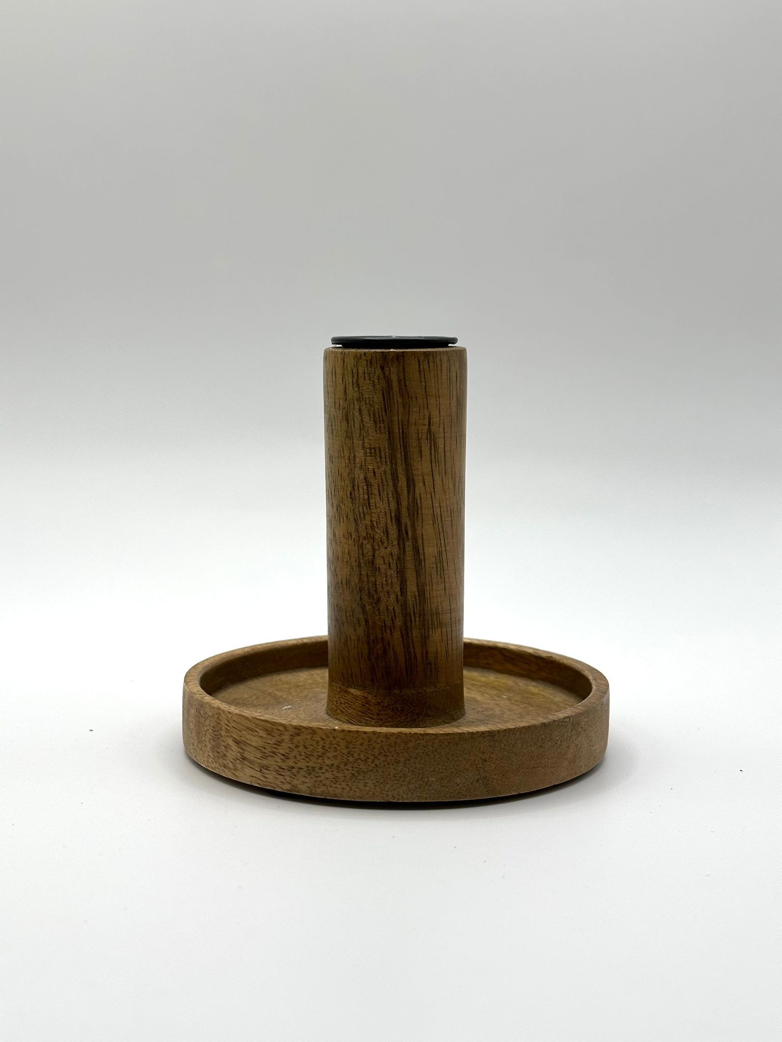 Stijlvolle houten kandelaar met natuurlijke uitstraling. Tijdloos design, perfect voor dinerkaarsen en sfeervolle tafeldecoratie.