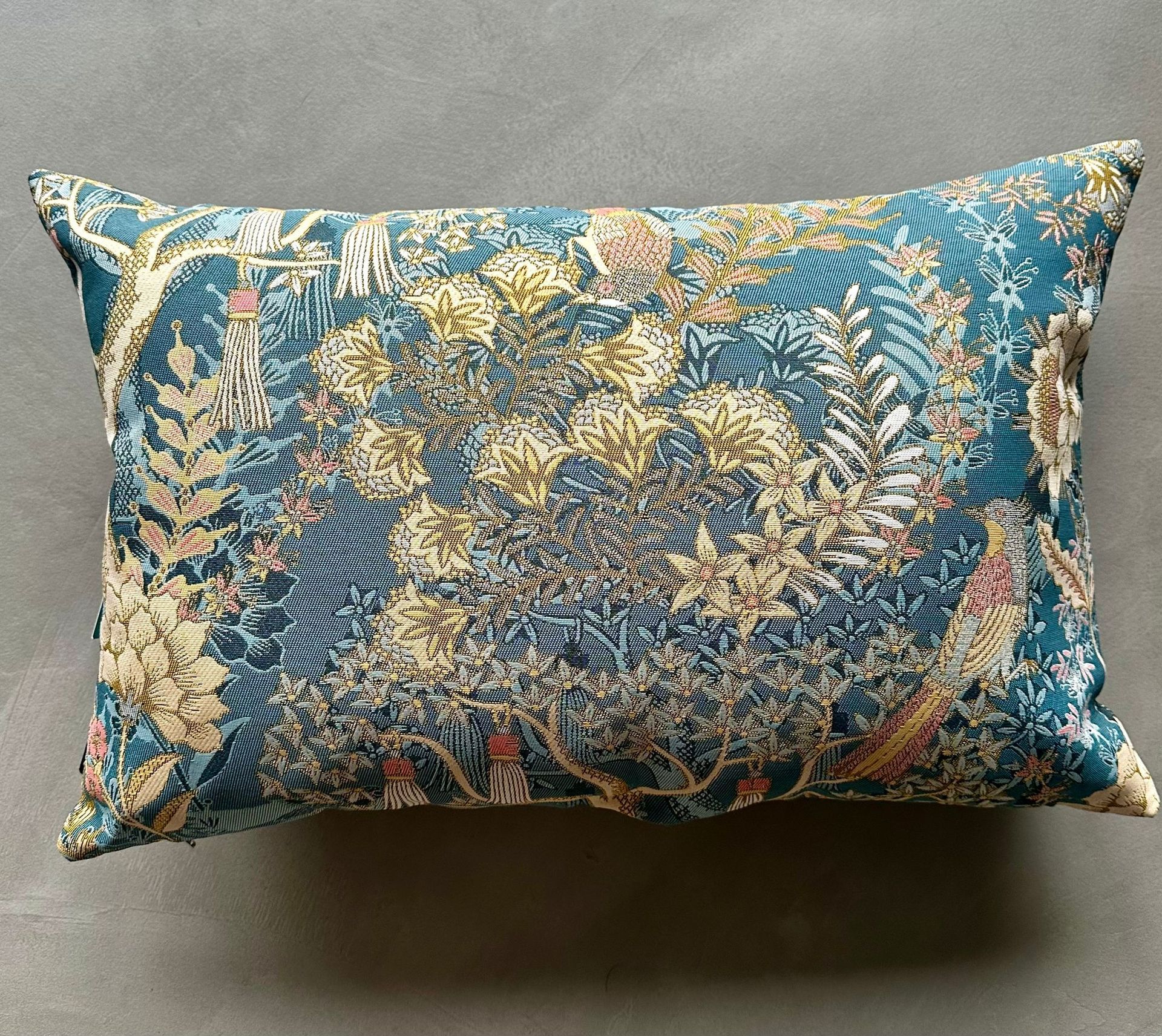 Dit kussen is een echte eyecatcher dankzij het ingeweven jacquardmotief van takken, bloemen en vogels. De subtiele kleurencombinatie van blauw en beige maakt dat dit kussen perfect past bij diverse woonstijlen.