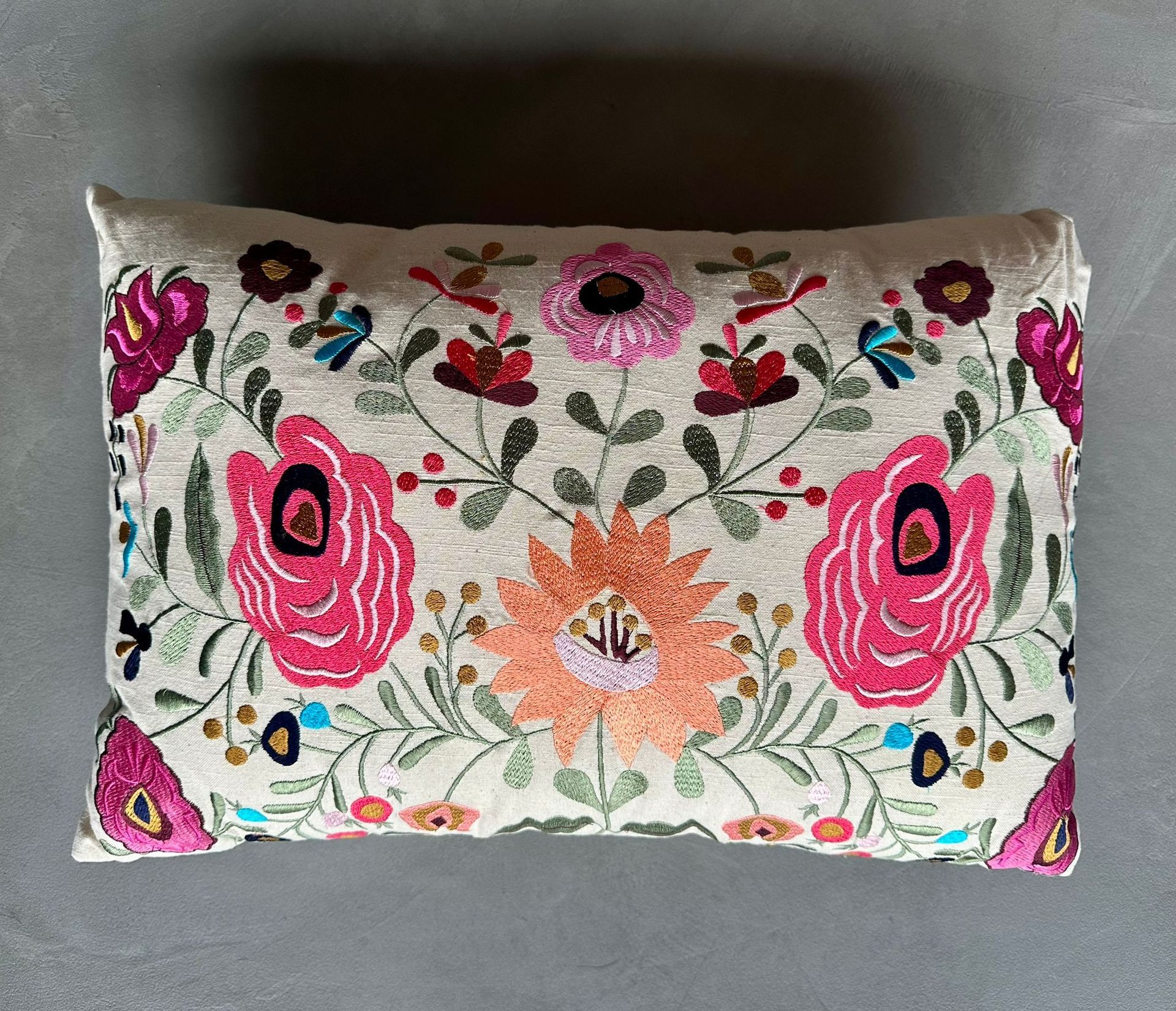 Dit unieke kussen is met de hand geborduurd en straalt ambacht en vrolijkheid uit. De kleurrijke bloemen op een zachte ecru achtergrond maken van elke ruimte een bloeiende oase. Perfect als statement piece op je bank, stoel of bed.