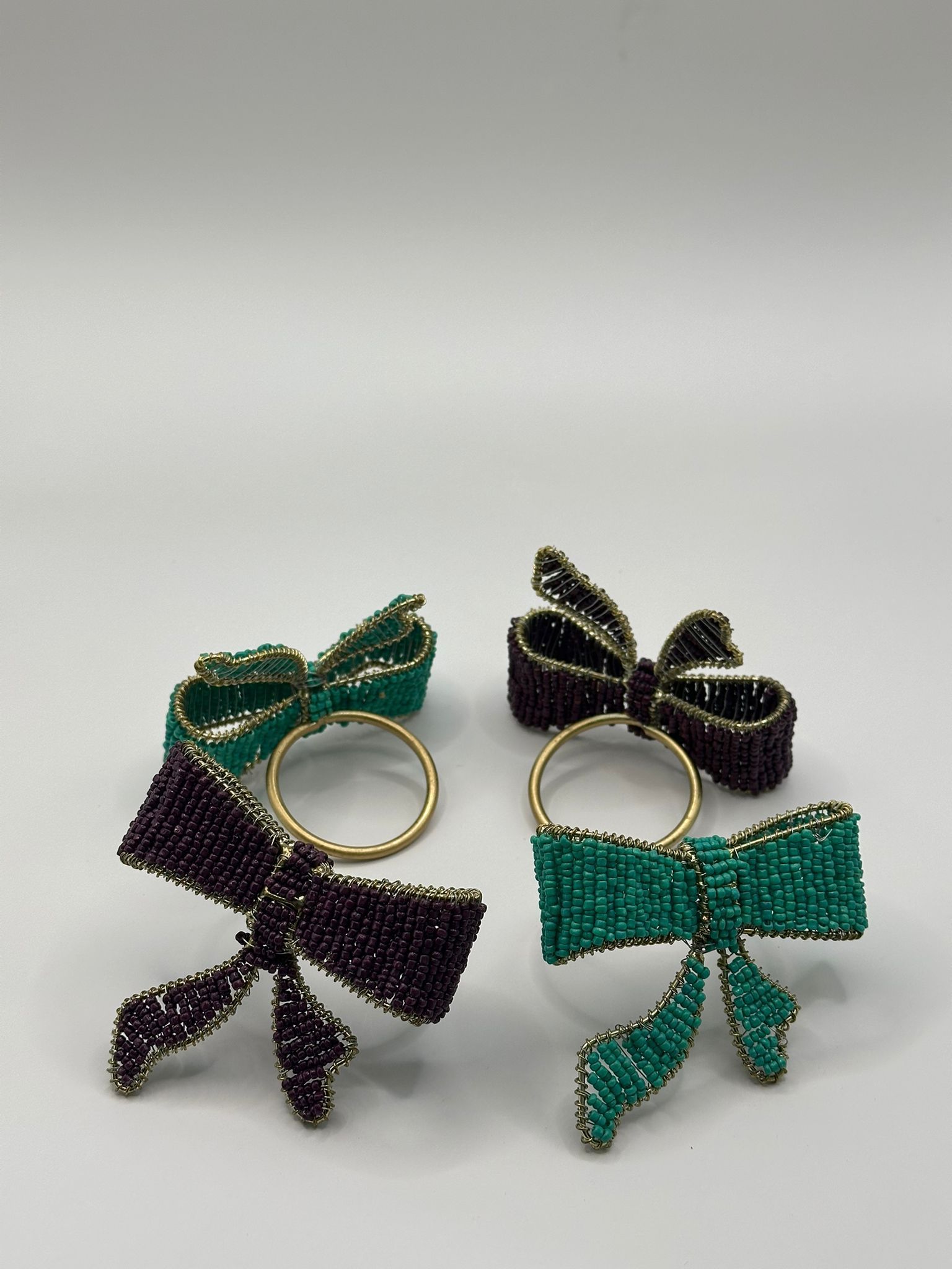 Set van 4 handgemaakte servetringen met kralen en een elegante strikvorm. Een charmante toevoeging aan je tafelsetting – perfect voor feestelijke diners en speciale gelegenheden.