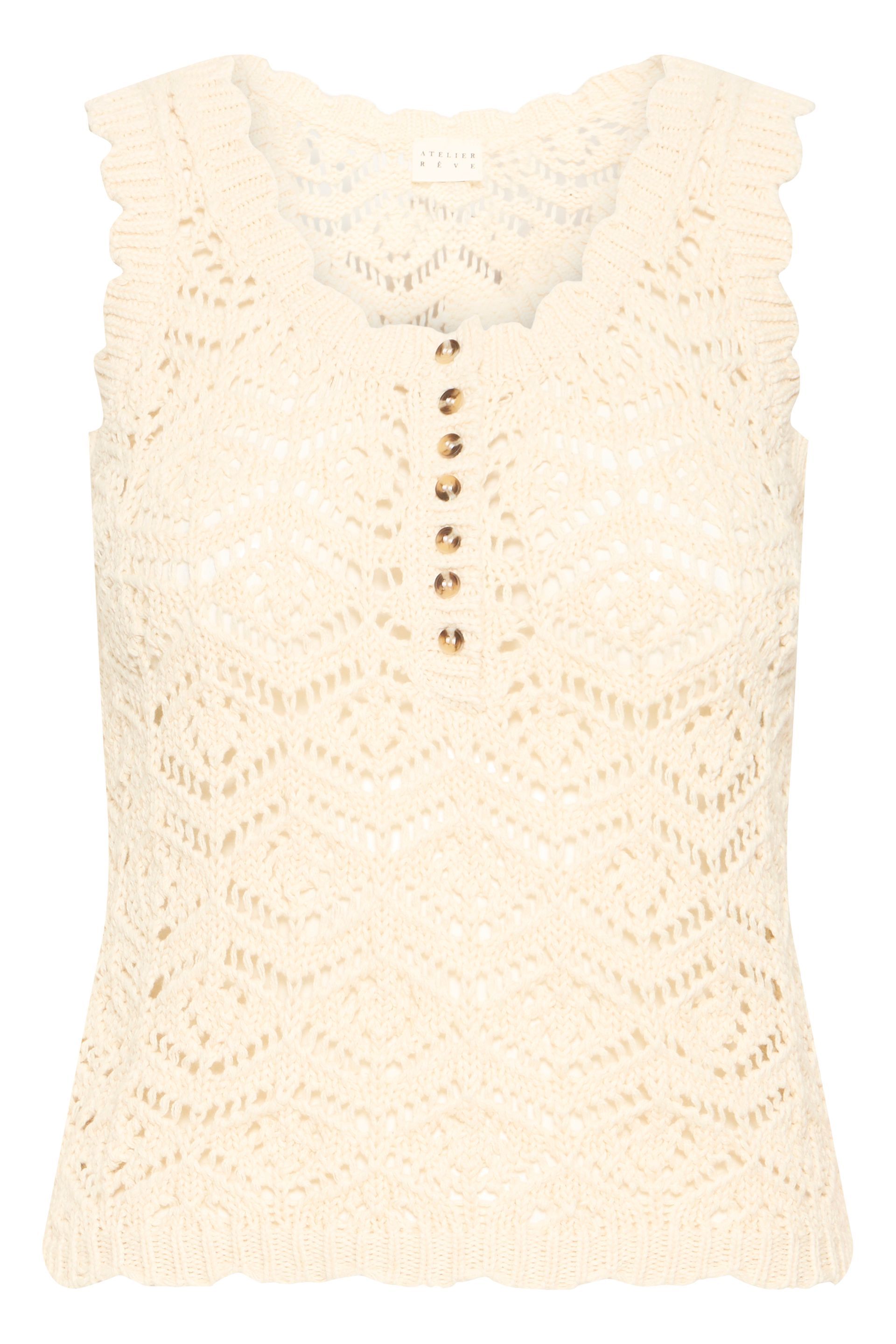Deze top is een romantische, fijngehaakte crochet top met een elegante scallop‑afwerking langs hals en armsgaten. De subtiele chevron‑structuur en de goudkleurige knoopjes aan de voorzijde geven dit item een vrouwelijke, verfijnde uitstraling. Gemaakt van een zachte, luchtige kwaliteit die heerlijk draagt op warme dagen. Perfect te combineren met zowel denim als een mooie rok voor een stijlvolle, zomerse look.