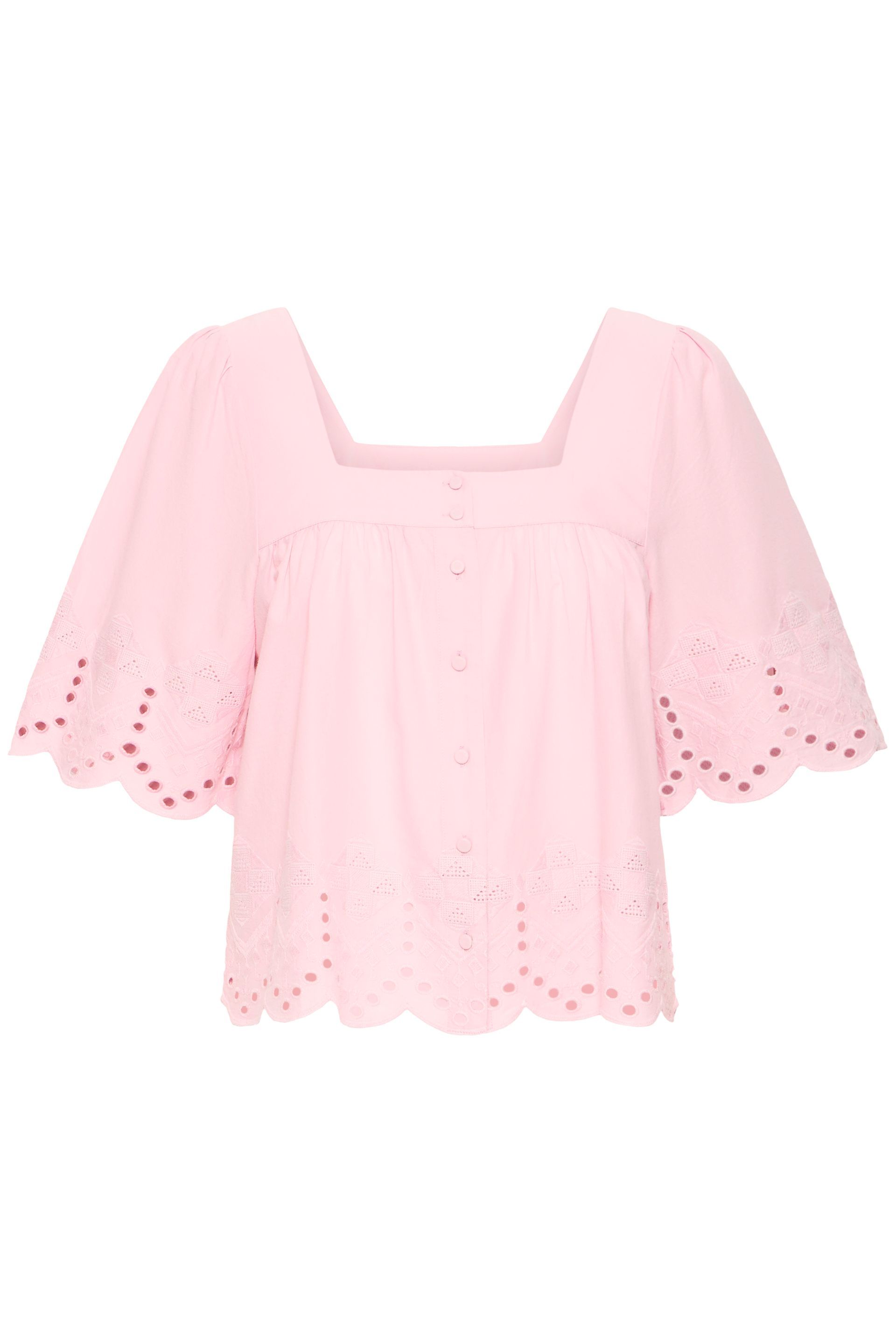 Deze top is een romantische, lichtroze blouse met een vierkante halslijn en prachtige broderie‑details. De wijde mouwen en geschulpte randen geven het item een luchtige, vrouwelijke uitstraling, terwijl de knoopsluiting aan de voorkant zorgt voor een elegante afwerking. Een zomerse must‑have die moeiteloos combineert met zowel denim als de bijpassende rok voor een co-ord set.